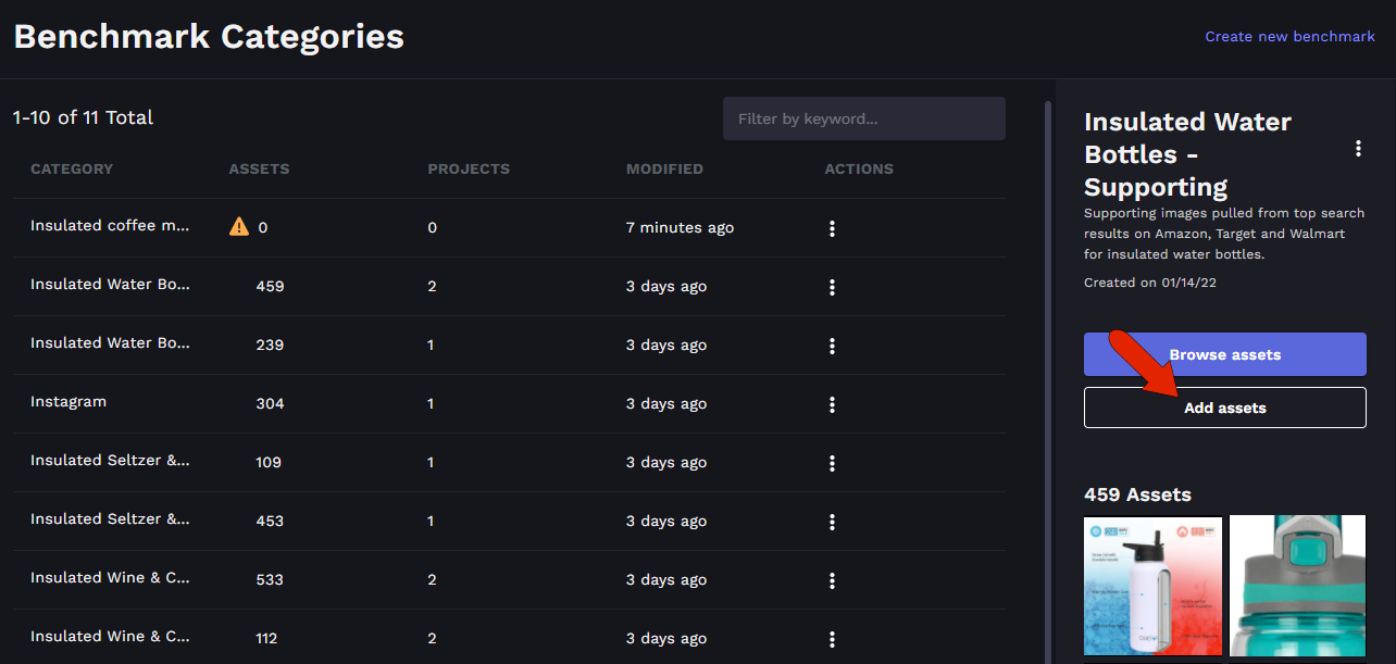 With your benchmarks list open, click the name of the benchmark you want. On the preview that opens on the right, click Add assets.