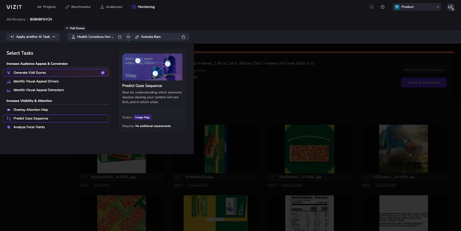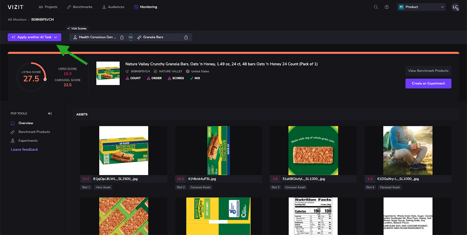 Once you open a Monitor, you will see a gallery of the assets in that product listing, in the order in which they appear on the retailer. Each asset will have a Vizit Score, which contributes to the overall Listing Score of this monitor.