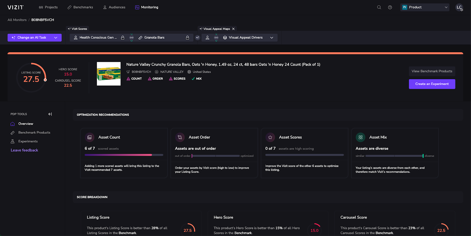 - Asset Count - this will determine if you have enough scored images in your listing. Vizit recommends 7 images total–1 hero image and 6 carousel images.