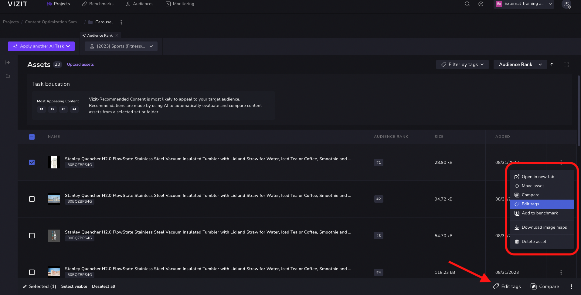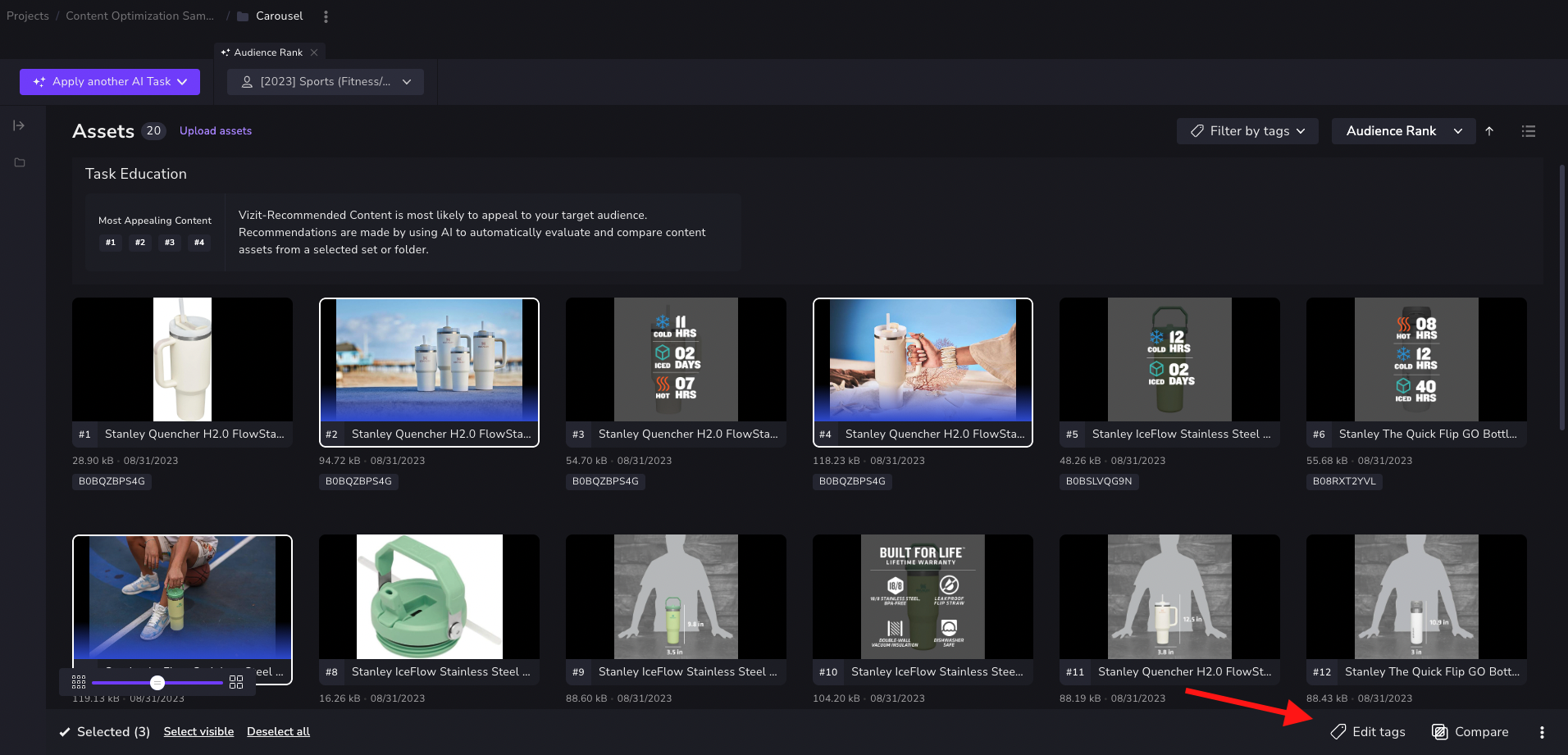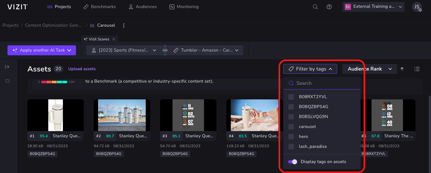 As with a set of un-segmented project or folder images, tags can be used to segment images for audience ranking, benchmark scoring (Vizit scores), scoring comparisons, or image map analysis.