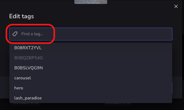In the Edit tags window, clicking in the Find a tag field displays all tags defined in the workspace. These can also be seen in the Tag manager.