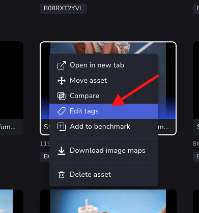 For images displayed in list view, use the checkboxes to select the images to tag. The three-dot icon for a single image has the Edit tags option, or for multiple selected images, click Edit tags at the lower right.