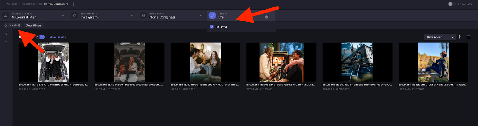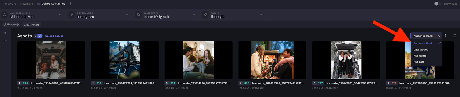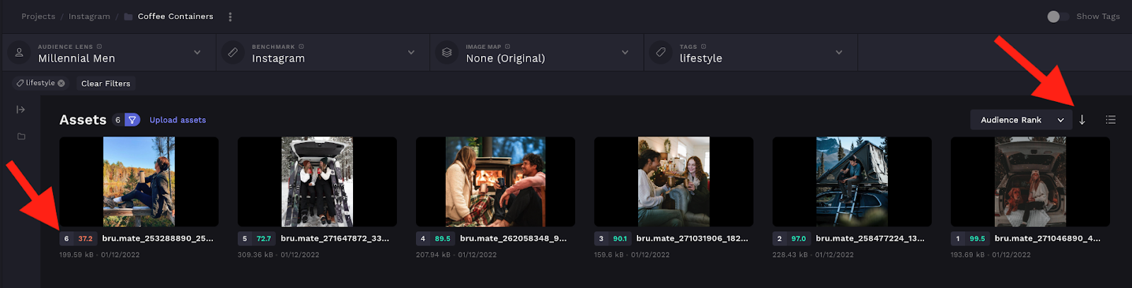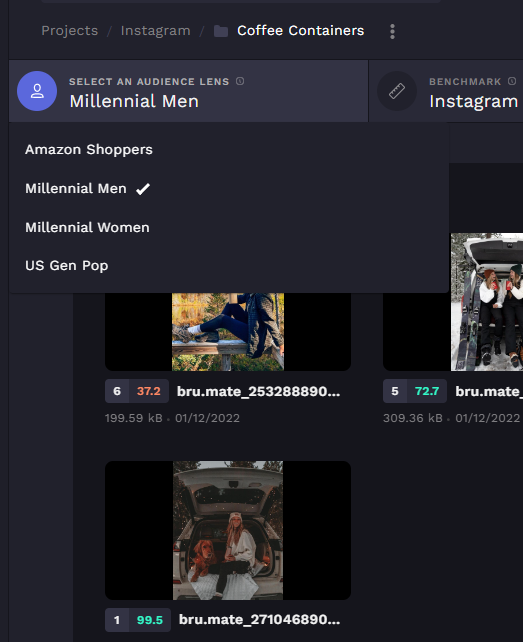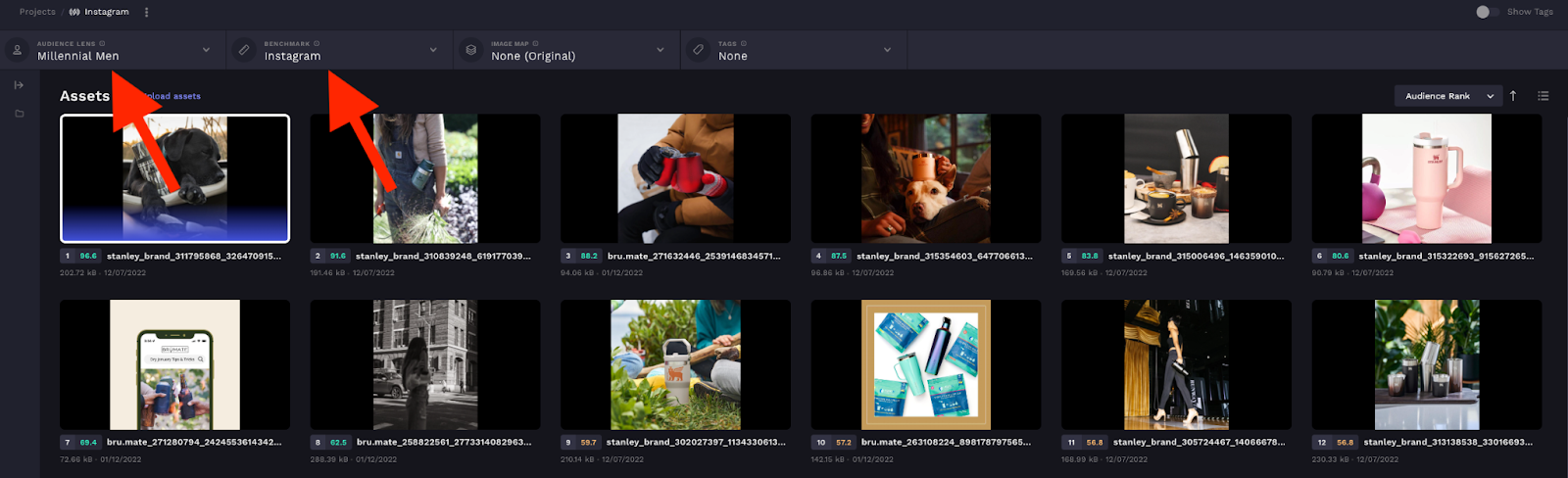 Each image within a project or folder is scored by an audience lens automatically. All images can be ranked, or displayed in order of Vizit scores so you can easily see which images are the most and least engaging by selecting an Audience Lens and a Benchmark to filter the project or folder images.