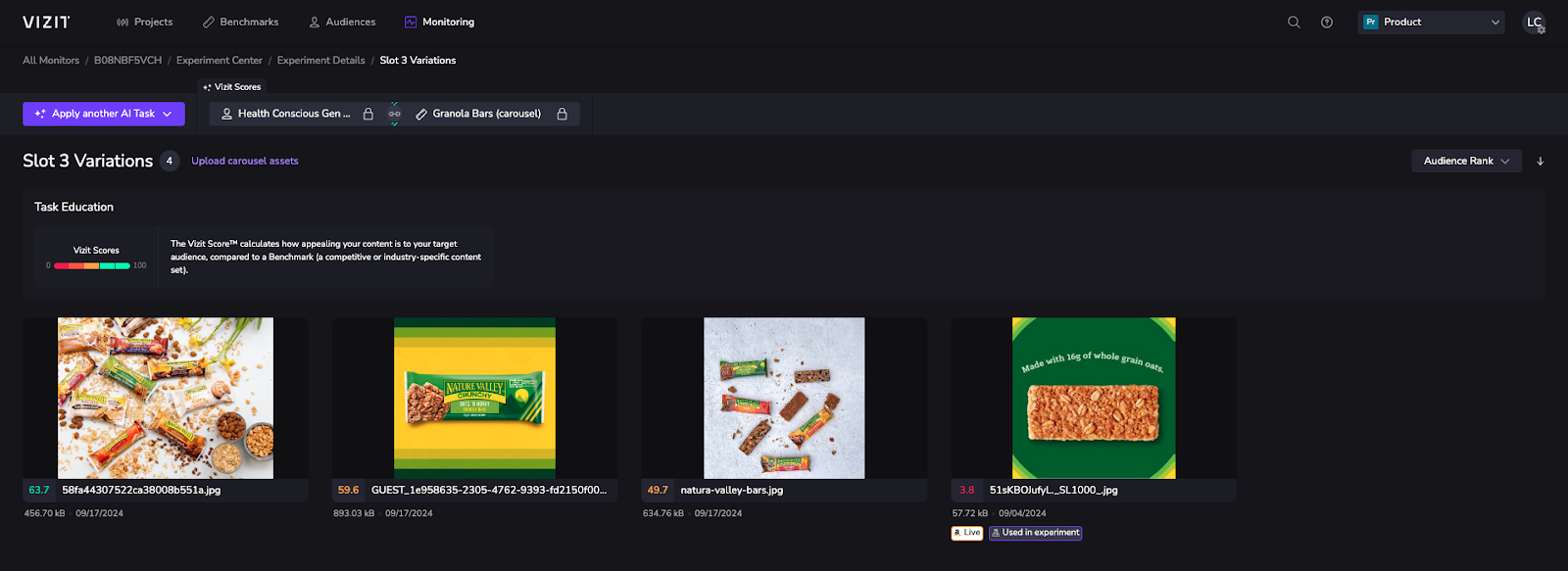 If you want to work on making optimizations to an existing asset, click View Variations. Within a variation, you can upload multiple assets to consider using in that slot of your listing. Vizit will automatically arrange your variations from highest to lowest scoring.