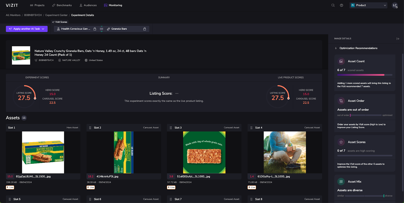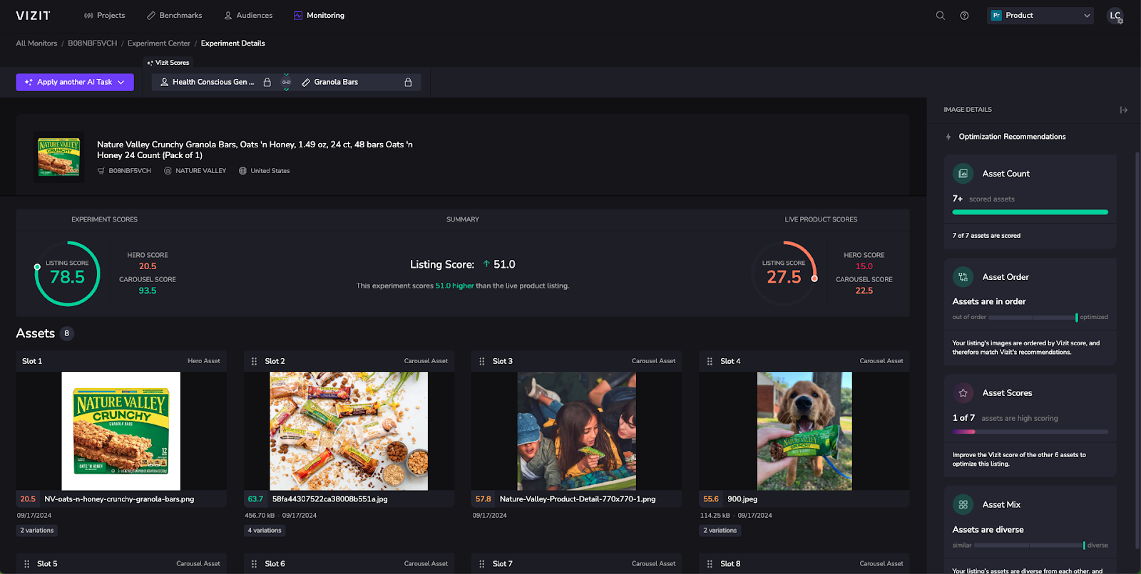 Within an Experiment, the right side panel shows you how your listing scores against Vizit’s four optimization recommendations. The four recommendations for optimizing your listing are: