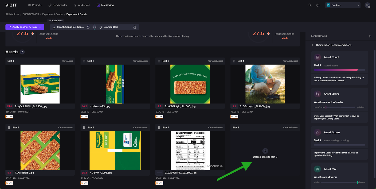 There are multiple actions you can take in an experiment to improve your listing. One is uploading a new asset. At the bottom of your listing, click the empty slot to upload a new asset.