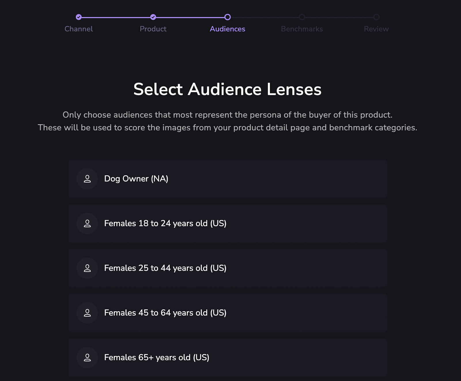 Choose the audience that most represents the persona of the buyer of this product. This will be used to score the assets from your product detail page and benchmarks.
