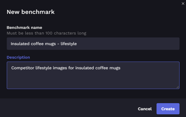In the New benchmark window, assign the benchmark a unique and informative name. The description field is where you can add details on benchmark content.