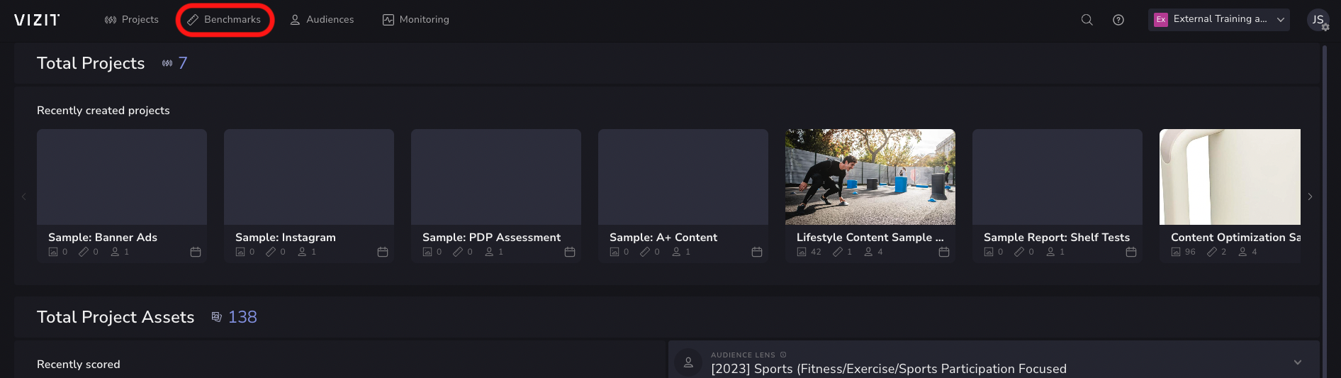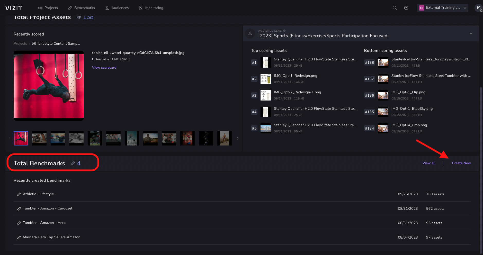 From your workspace dashboard, scroll down to the list of recent benchmarks. Hover over the Total Benchmarks bar, and click Create New.