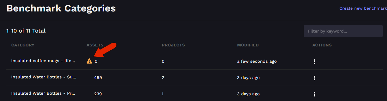 Click Create, and the benchmark appears on the Benchmarks page, with a warning icon indicating that the benchmark has no images. A minimum of 30 images is needed for a benchmark to be used for generating scores.