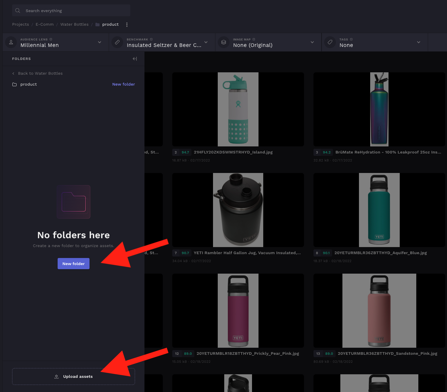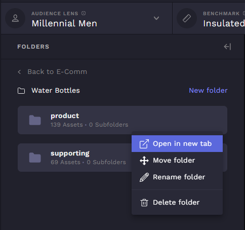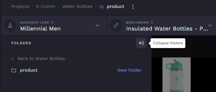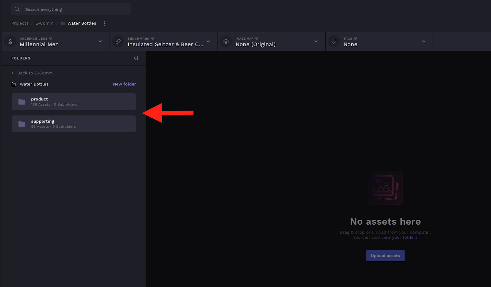 To add assets and analyze assets in the opened folder, close the folder drawer by clicking "collapse folders" to close the drawer and work with the assets in your folder. Assets can be uploaded by dragging and dropping into the opened folder once the drawer is closed.