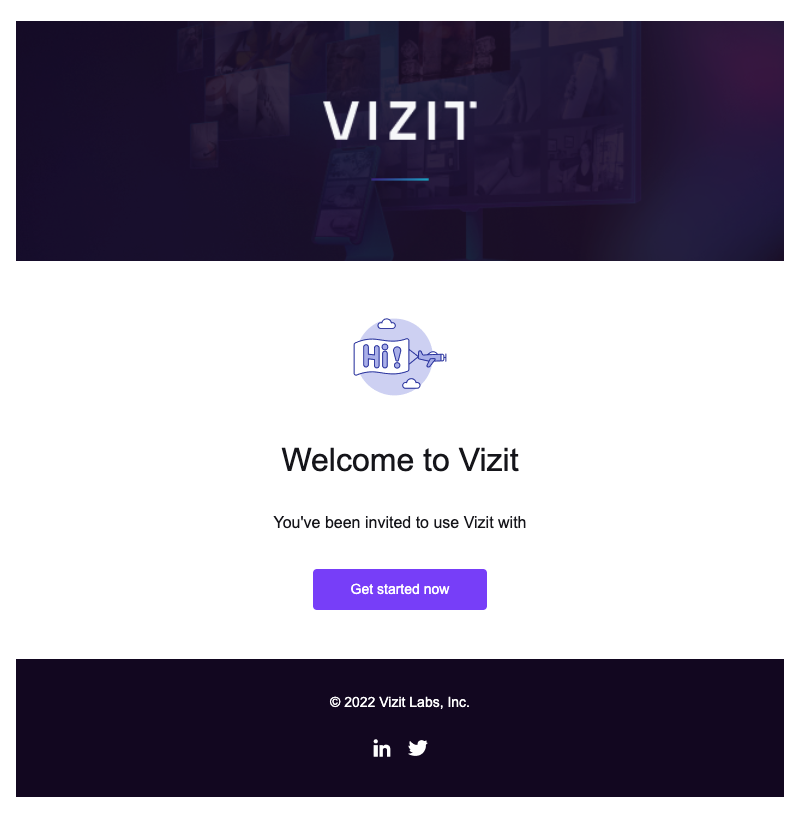 Once invited, you will receive an email from support@vizit.com, with a link to sign up. Click Get started Now.