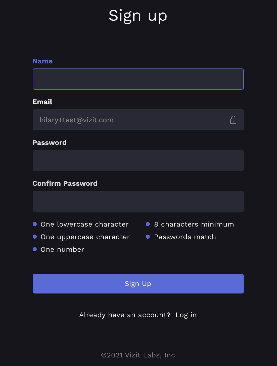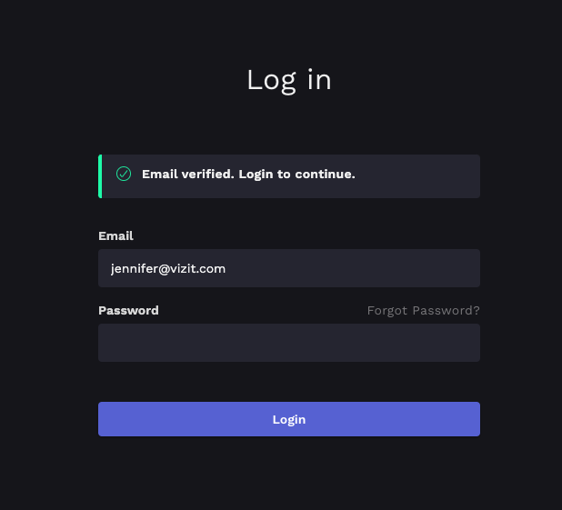 Once you have clicked the link to verify your email, you will then be able log in with the email and password you registered to create your Vizit account.