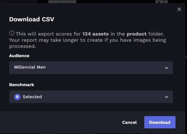 You can download a CSV file that lists audience scores for all images within a project or folder. This file also lists Vizit scores for one or more benchmarks.
