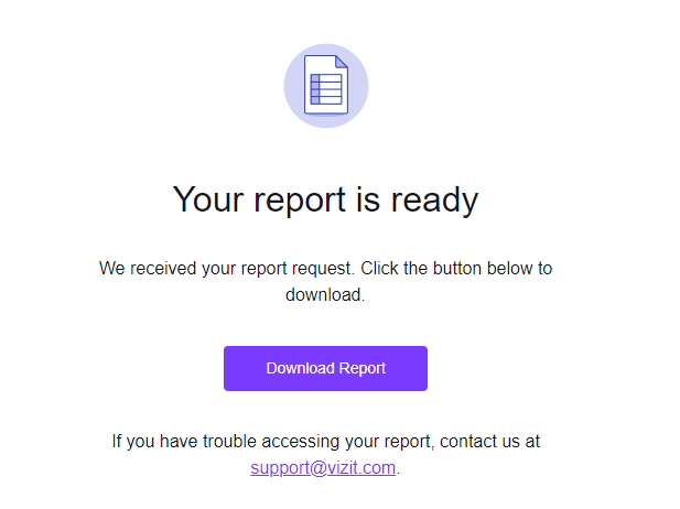 Once the file is generated, it can be sent to your email from support@vizit.com where you can access the CSV download. Clicking on the "Download Report" button in your email will take you back to the Vizit platform and the download will start automatically.