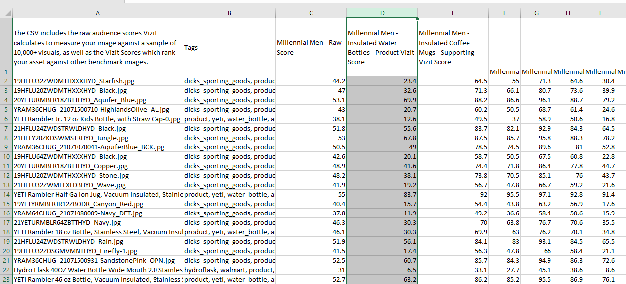 In the spreadsheet, the first set of scores are the audience scores ("raw scores") for the selected audience, shown in column C. To the right are Vizit scores for each selected benchmark.