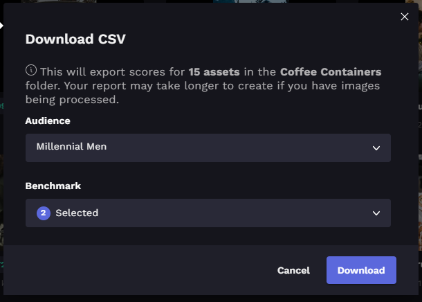 In the Download CSV window, confirm the audience, and choose one or more benchmarks. Then click Download.