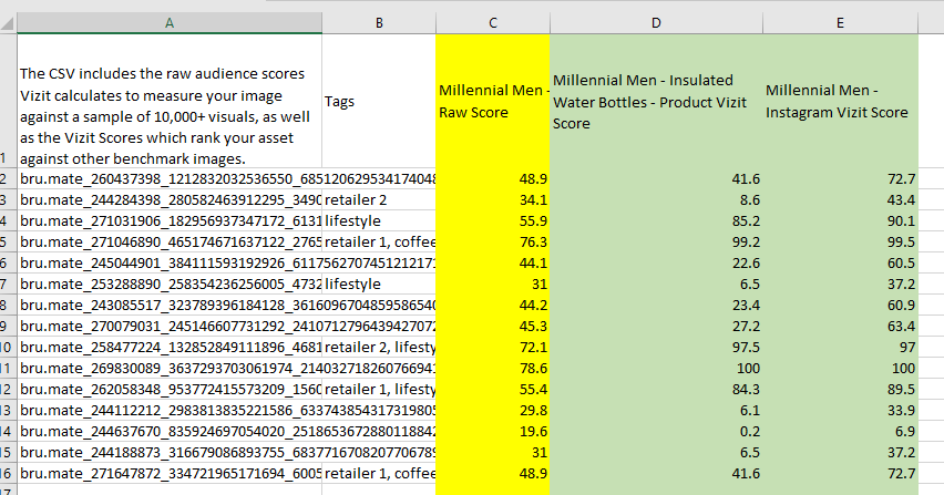 You can download a spreadsheet file that lists Vizit scores (benchmark scores) for all images within a project or folder. This file also lists audience raw scores.
