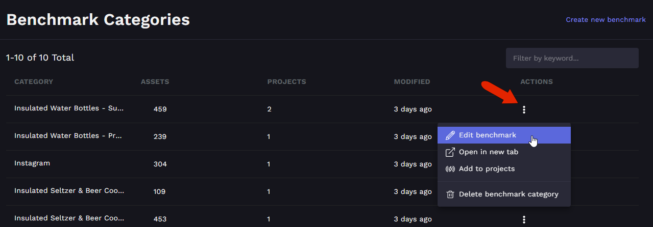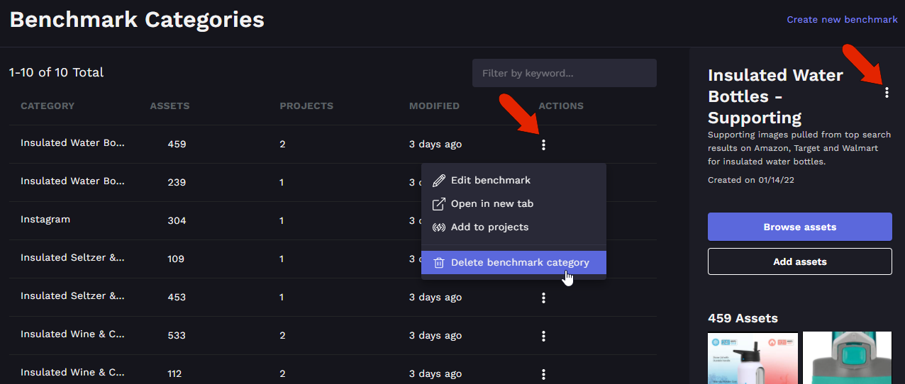 There are two ways to edit or delete a project.  Note that editing includes changing the project name, managing audiences, or managing benchmarks, but not adding images or deleting images.