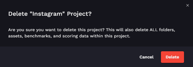 If you delete a project, you’ll need to confirm. Keep in mind that deleting a project also deletes the images in the project, as well as any scoring data. If any project images are also used in benchmarks, those images will remain in their benchmarks.