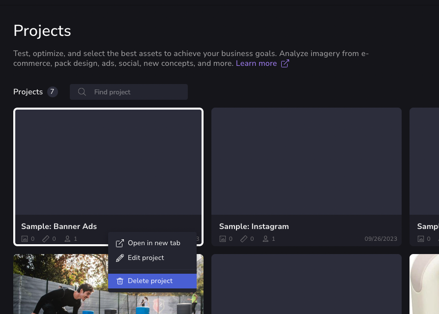 There are two ways to edit or delete a project. Note that editing includes changing the project name, managing audiences, or managing benchmarks, but not adding images or deleting images.