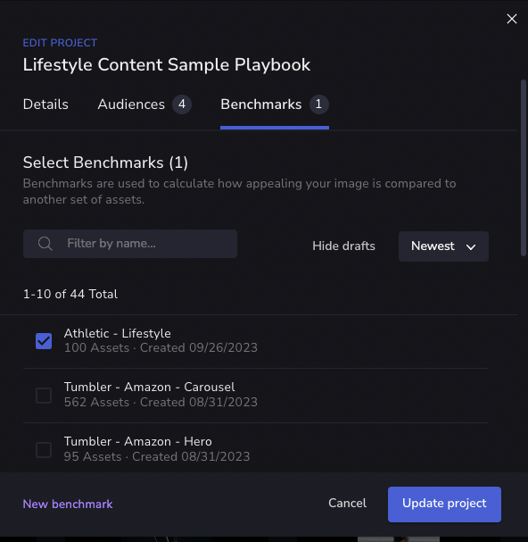 Choosing Edit project opens the Edit Project window, where you can use the Details tab to change the project name, or the other two tabs to change project audiences or benchmarks.