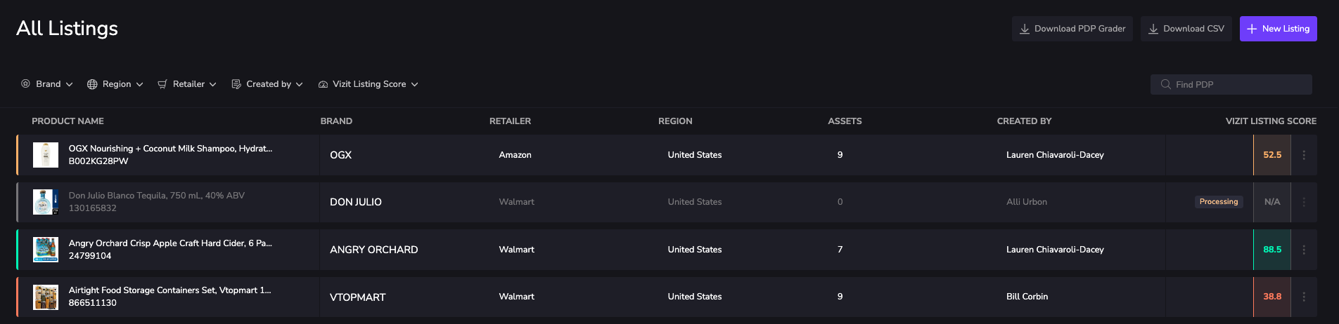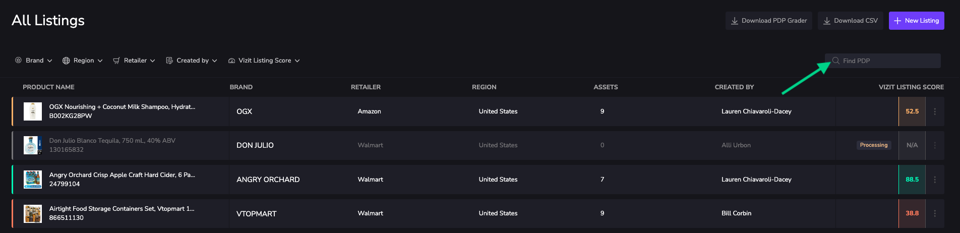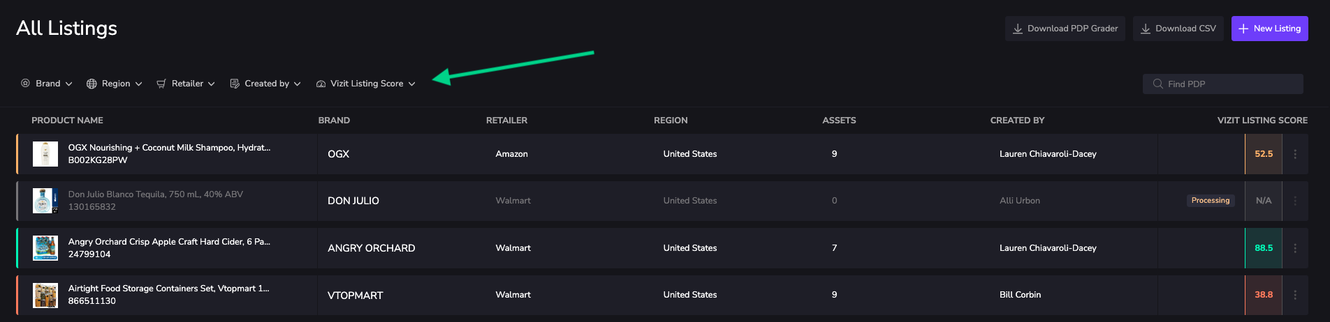 You can use the filters to reduce the number of rows that are displayed. You can filter by brand, region, retailer, who created the listing, and listing scores.