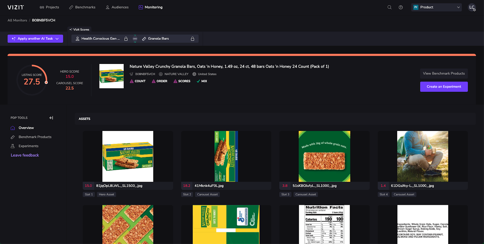 From here, you can create an experiment, explore the products in the benchmark that your product is being scored against, and view any existing experiments you’ve already created for this product.