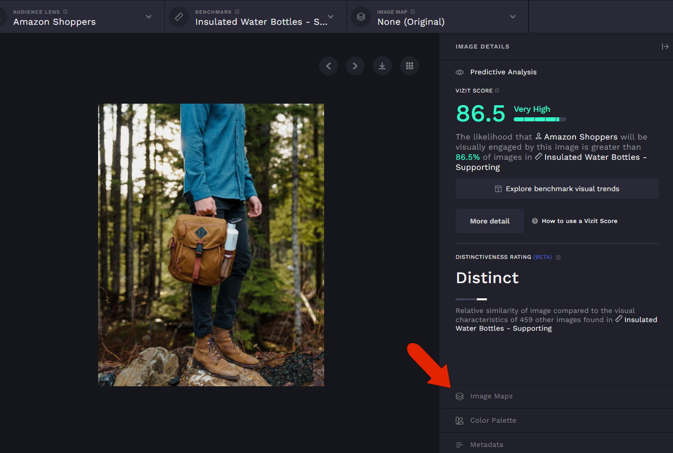 When viewing a project image’s Vizit score, there are three sections on the right, below the Predictive Analysis section: Image Maps, Color Palette, and Metadata