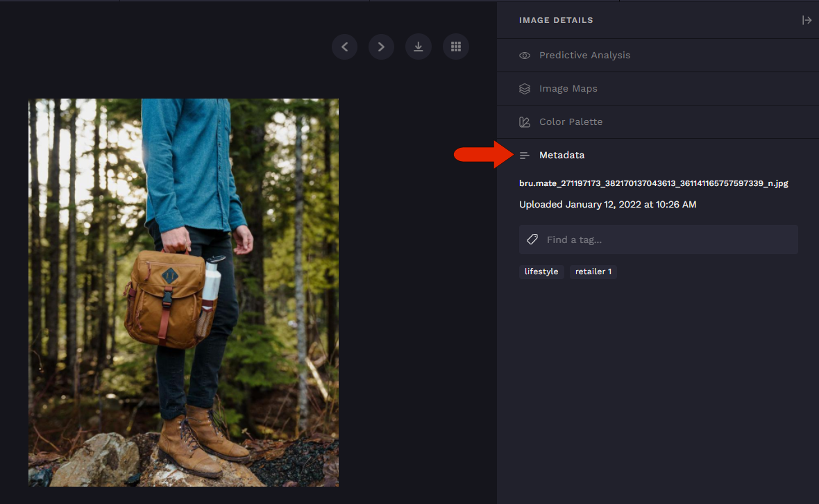 The Metadata section lists the image file name, upload date and time, and tags. You can also assign new tags here, remove tags, or create new tags.