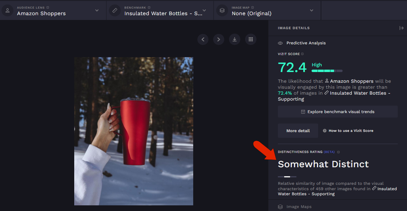 Below a project image’s Vizit score is the image’s Distinctiveness Rating, for the selected audience and benchmark.