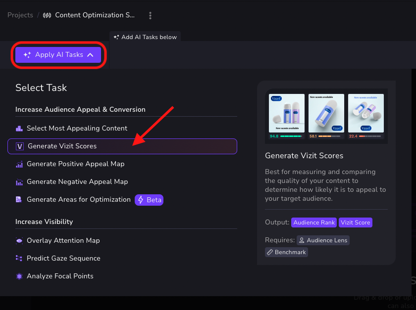 Select the AI Task button and select the Generate Vizit Score task from the AI Task menu