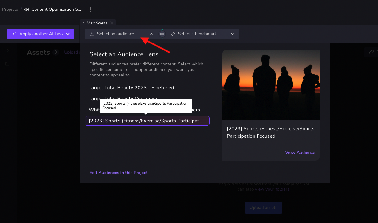 Next, select the audience lens to apply to the project to drive the first step of generating the Vizit Score