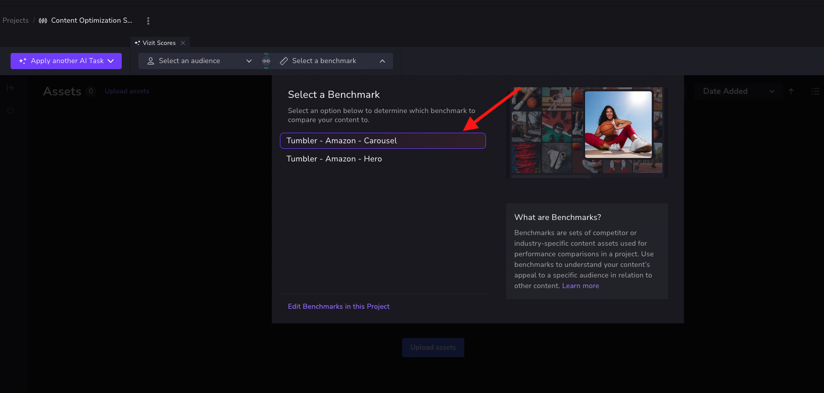 Note that although multiple benchmarks can be added to a project, only one benchmark at a time can be used when viewing an image’s Vizit score. But the Compare feature enables you to simultaneously compare one or more project images against one or more benchmarks.