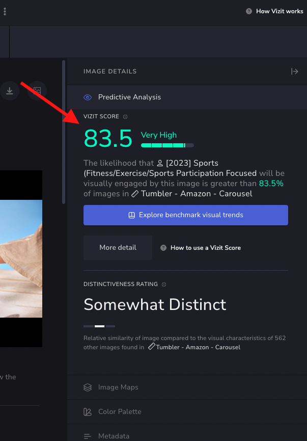 Note: This article explains how to view the score for a single image. You can also download Vizit scores for all images in a folder or project, or use the Compare feature to view multiple scores side-by-side, for up to 10 project images.