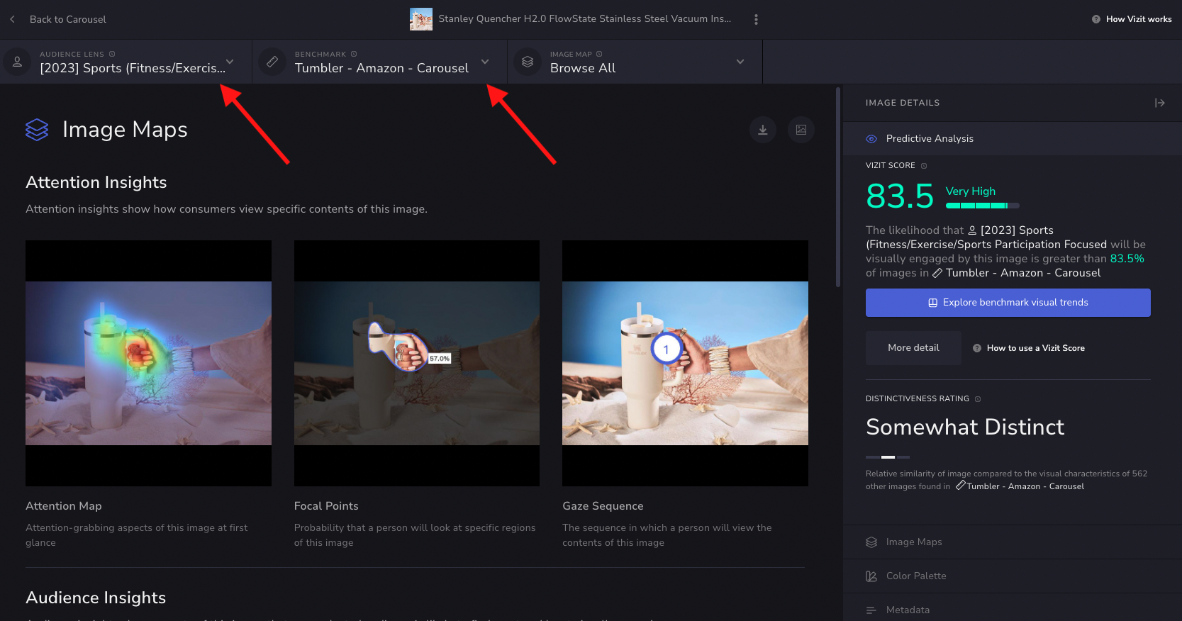 You can also take a deeper look into the benchmark visual trends, view the image’s Distinctiveness Rating, as well as image maps, color palette, and metadata.