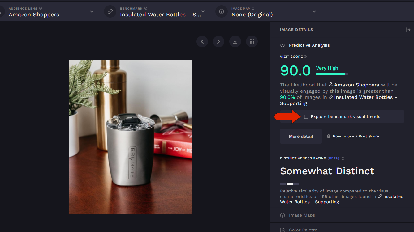 Within a project image's scorecard, there is a button just below the image's Vizit score, click Explore benchmark visual trends.