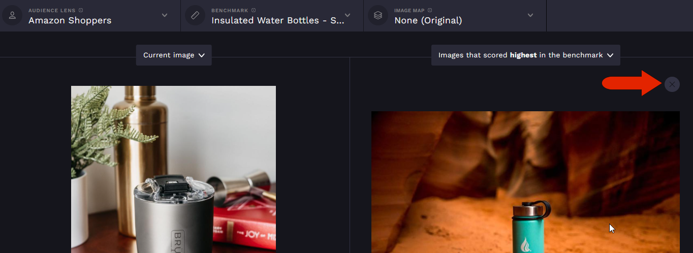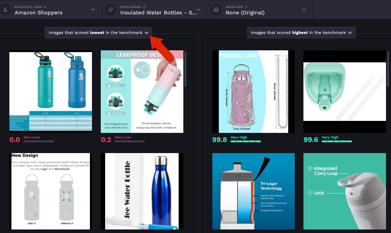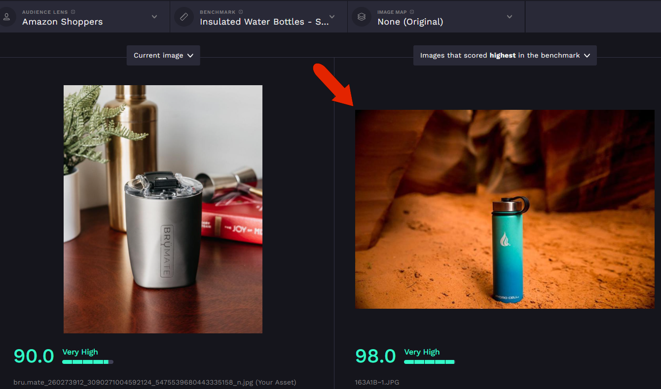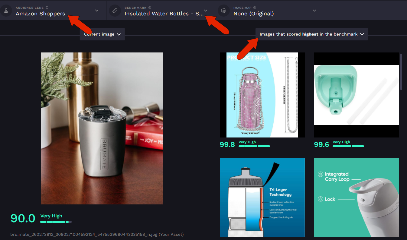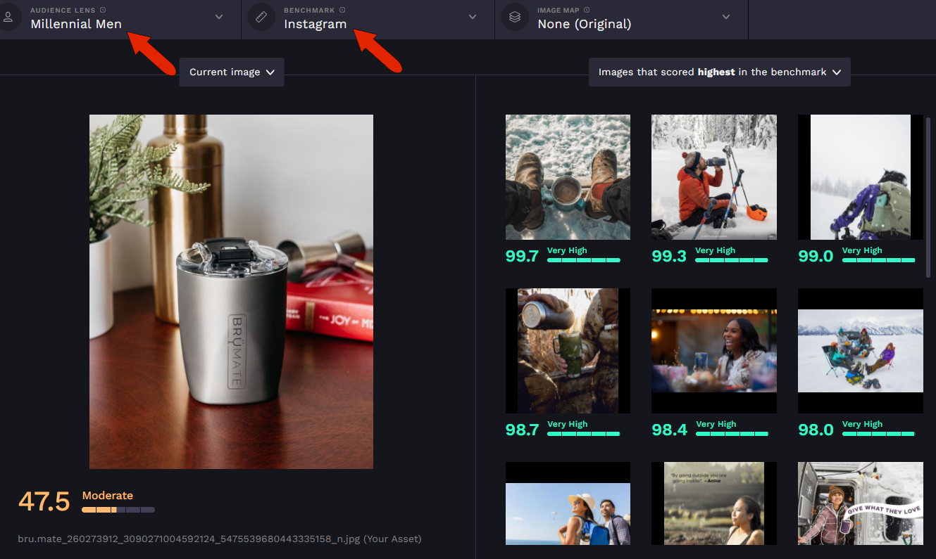 Either option you choose will open a side-by-side comparison, with the project image on the left, and either higher or lower scoring benchmark images on the right, depending on the option you select at the top right. The current audience and benchmark are listed across the top.