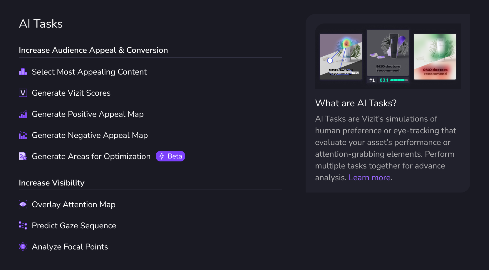 AI Tasks help streamline how you uncover and interpret the insights Vizit provides for your assets. Select a specific task to find out exactly what you need to know about your assets — like how likely they are to appeal to a certain audience, or where visual attention is focused.