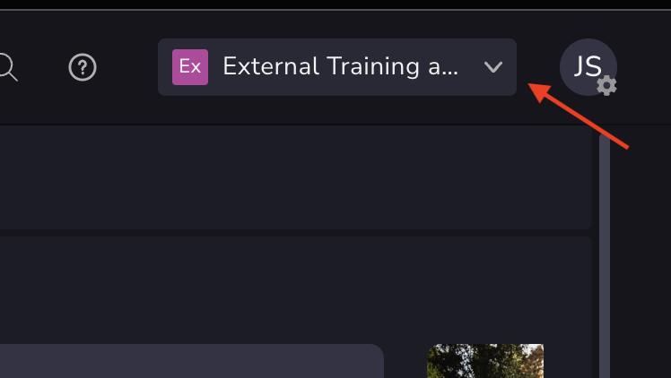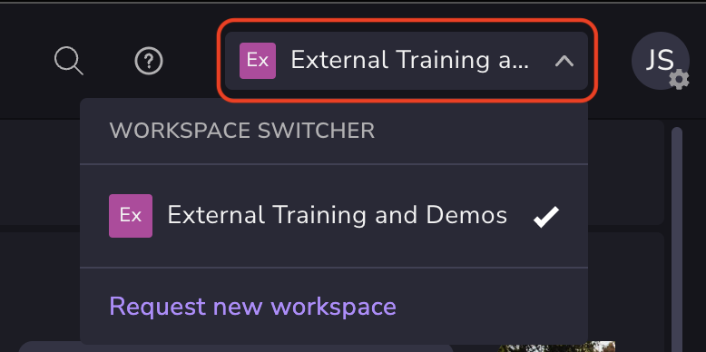 If you have access to more than one workspace, you can switch workspaces by clicking the arrow below the current workspace and click the workspace you want to open.