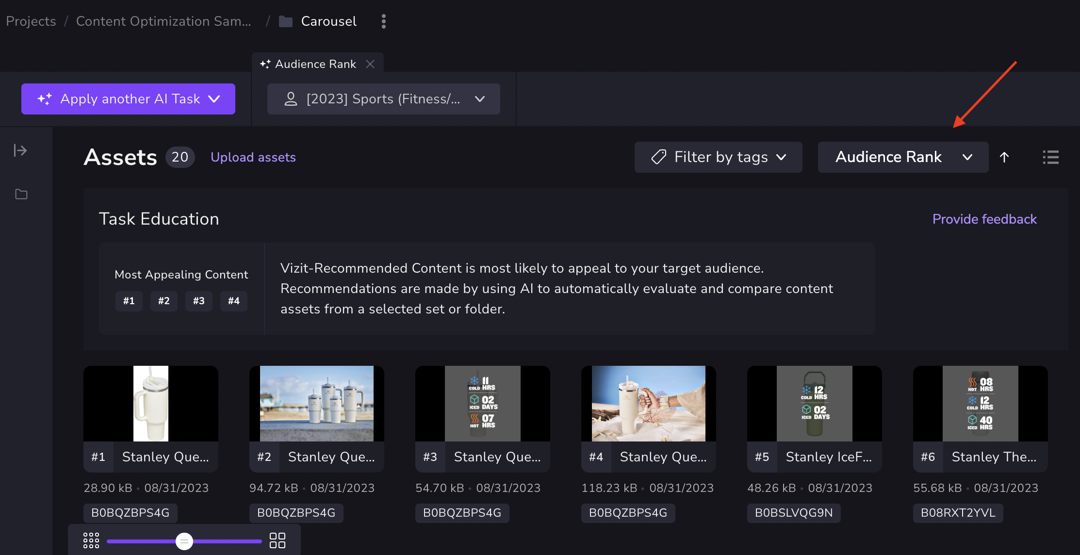Every image added to a project or folder is automatically assigned an audience score for every audience defined for the project. This score reflects predicted audience engagement for the image.