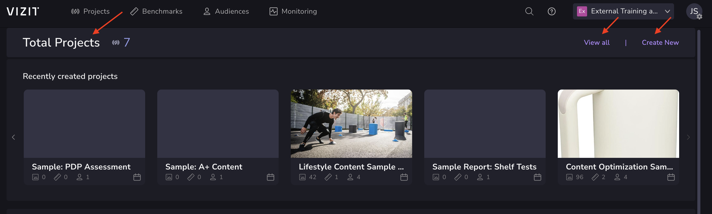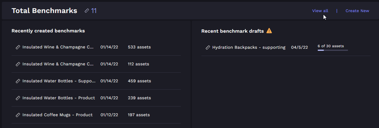 At the bottom of the dashboard is the list of your recently created benchmarks. Hovering over the Total Benchmarks bar displays options to view all benchmarks, or create a new benchmark. Any benchmark that contains less than 30 images will be listed as a draft, along with the number of additional assets needed for the benchmark to reach 30. The reason for draft status is that a benchmark with less than 30 images cannot be used to generate Vizit scores.