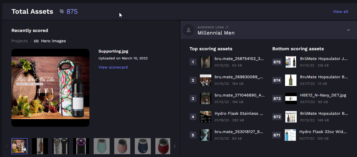 Below projects are total assets: all images added to all projects. Hovering over the Total Assets bar displays an option to view all assets. To the right of the most recently scored asset are lists of highest and lowest scoring assets, according to the selected audience.