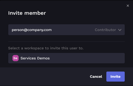 Enter the user’s email address, set their role, choose the workspace to which the new user will be added, and click Invite.