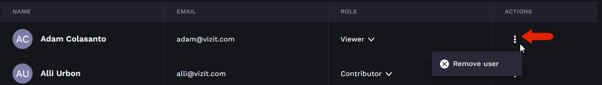 Admins can remove a user by clicking the ellipses at the end of the user row.